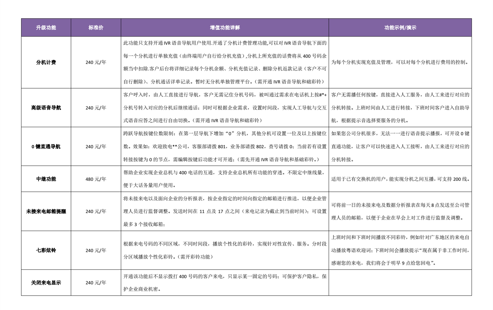 幫助企業實現企業總機與400電話的互通,支持企業總機所有功能的穿透。默認接通10線,增線需加付功能費,按照30元/線/月收取,上限為200線。