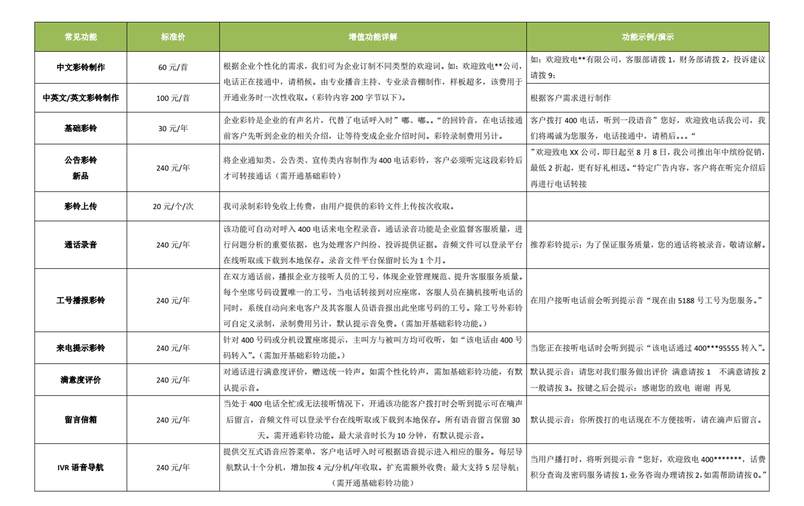 將企業通知類、公告類、宣傳類內容制作為400電話彩鈴,客戶須聽完這段彩鈴后才可轉接通話(需開通基礎彩鈴)