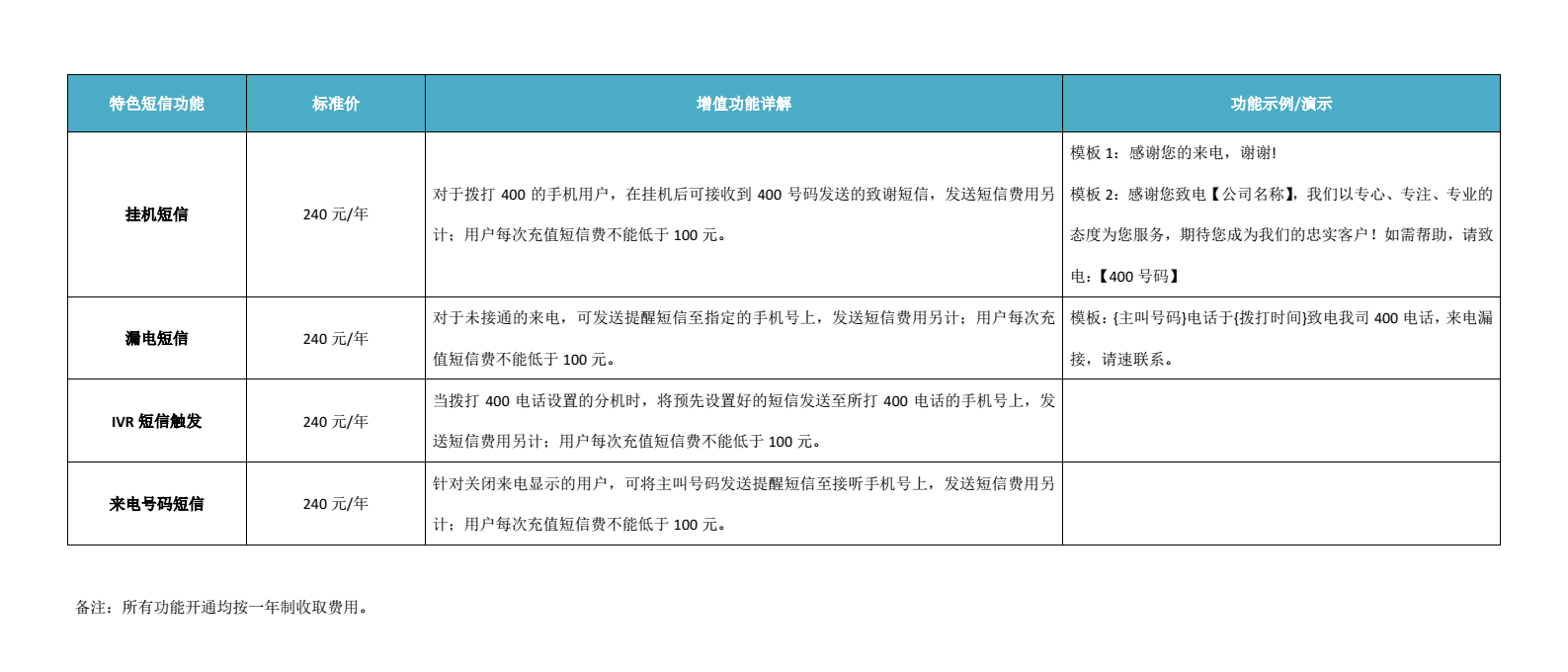 當撥打400電話設置的分機時,將預先設置好的短信發送至所打400電話的手機號上,發送短信費用另計;短信發送費率為0.1元/條,用戶開通短信業務首次預存不低于300元。